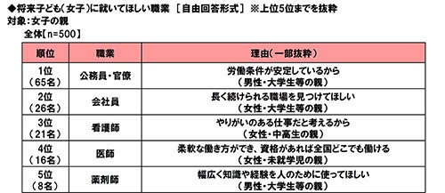 女子の親では、1位「公務員・官僚」、2位「会社員」、3位「看護師」、4位「医師」、5位「薬剤師」となり、TOP2は男女ともに「公務員・官僚」と「会社員」となりました。