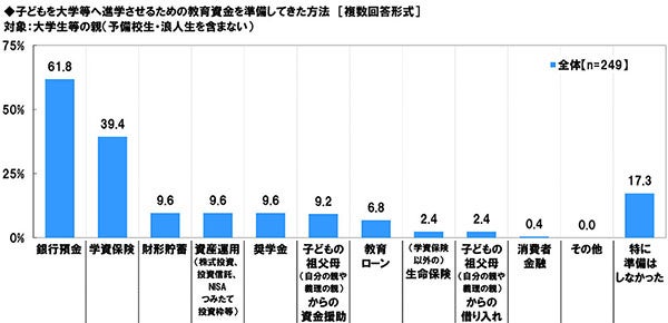 他方、大学生等の親(予備校生・浪人生を含まない)(249名)に、大学等への進学のための教育資金を、どのような方法で準備してきたか聞いたところ、「銀行預金」(61.8%)が最も高くなり、次いで「学資保険」(39.4%)となりました。また、「財形貯蓄」、「資産運用」、「奨学金」(いずれも9.6%)が同率で続きました。