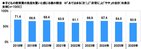 過去の調査結果と比較すると、子どもの教育費の負担を重いと感じる親の割合は、2025年64.5%→2026年60.9%とわずかに下降しました。(図3)