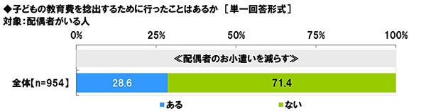 配偶者がいる人(954名)に、≪配偶者のお小遣いを減らす≫ことについて、行ったことがあるか聞いたところ、「ある」は28.6%となりました。家族にかかる費用や自身のための支出を抑えて、子どもの教育費に充てようと考えている人は少なくないようです。 (図7)