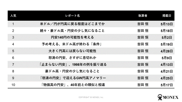 マネックス証券 チーフ・FXコンサルタントである吉田恒の為替レポートの人気ランキングを見ると、5月に入ってからも続く円安についての情報を求め、4月以上にレポートが読まれる状況になっています。引き続き、為替相場、金融政策についてのニュース、識者のレポートが求められていることが分かります。