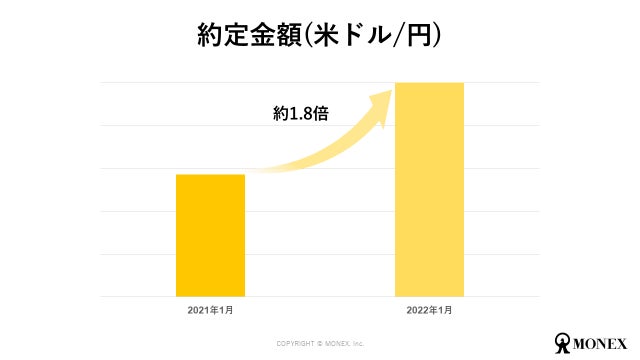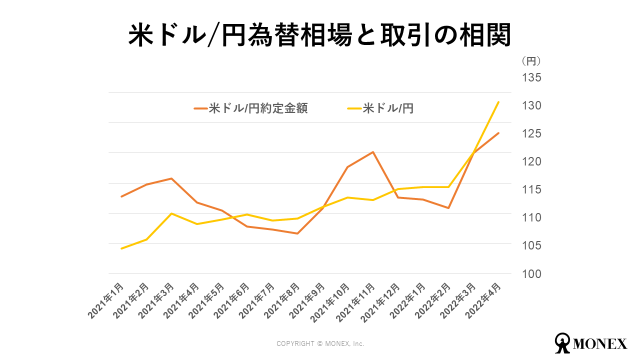マネックス証券における2022年4月のFXでの取引は、2021年4月と比べ全通貨ペアで約定金額が増えました。特に米ドル/円は他の通貨ペアに比べ、更に増えています。為替相場と約定金額を重ねてみると、相場の変動が見られたタイミングに取引が顕著に増えていることが分かります。今回の円安は、FXを行うお客様にとって、大きな取引機会となっていました。