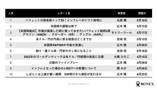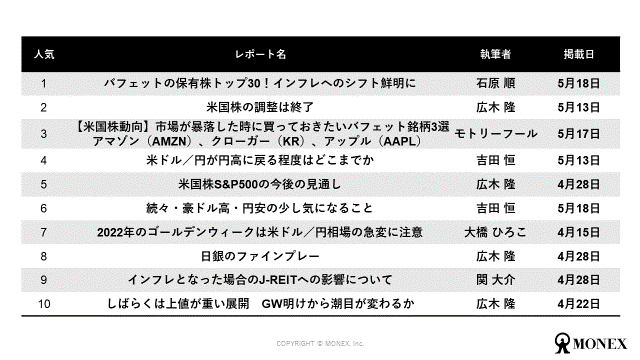 マネックス証券のオウンドメディア「マネクリ」に掲載されたレポートの、4月、5月のPVランキングを公表いたします。