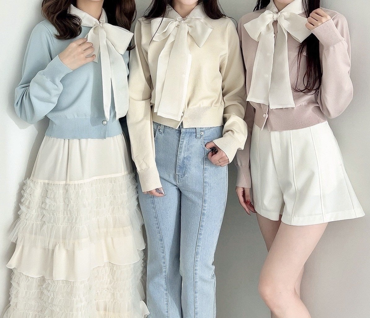 ボウタイリボンとコロンと大きなパールボタンが華やかなカーディガン。ボウタイは取り外し可能な2WAY仕様で、デイリー使いしやすいデザイン。