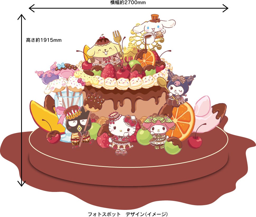 横幅約2700mm×高さ約1915mmのフォトスポットは、チョコレートをイメージした台座の上に、キャラクターやフルーツ、ケーキなどのパネルが配置され、正面から見ると立体的に見えるデザインになっています。お友だちや家族と一緒に撮るもよし!おひとりで映える写真を撮るのもよし!ハーモニーランドでの楽しみ方が一層増すフォトスポットです。