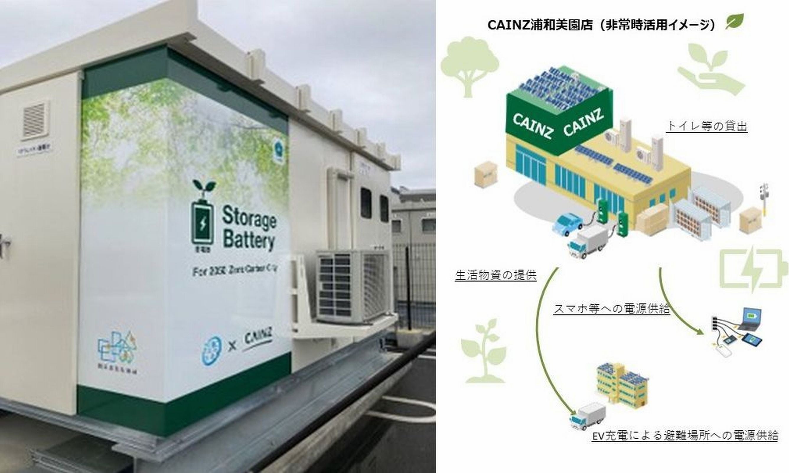 カインズ浦和美園店では、太陽光発電設備と蓄電池を使用したシステムを導入しました。これにより、平常時には、店舗で使用する電力の約4割を再生可能エネルギーで賄い、年間約220tのCO2削減効果を見込んでいます。非常時には、店舗内のPOSレジシステムや一部の照明・コンセント等の重要な設備に電力を供給し店舗営業を継続しつつ、近隣住民向けにスマートフォン等への充電のためにコンセントを開放する等、地域の一時避難所/復旧拠点としての役割を果たします。
