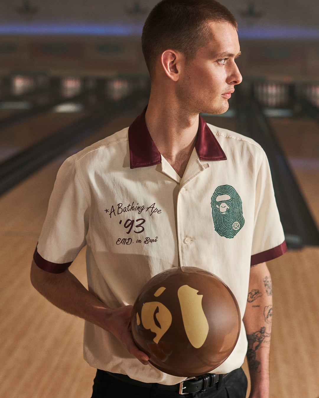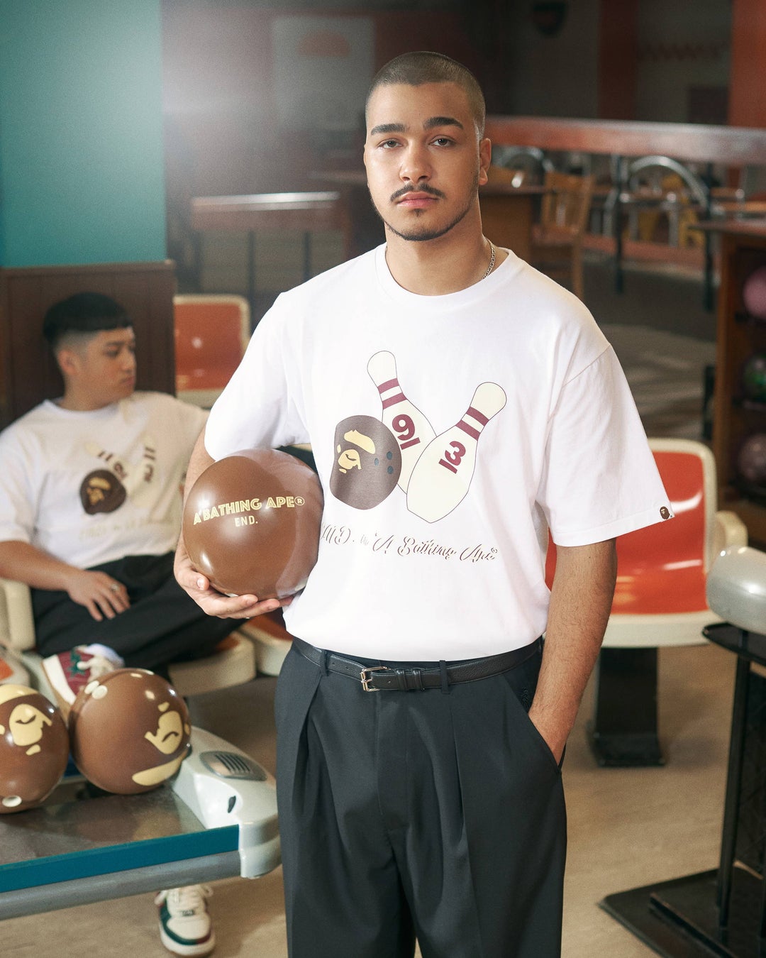 さらに、クロームコーティングが施されたEND.ブランドのシューレースステーや、インソールにはコラボレーションロゴがプリントされるなど、細部にまでこだわって仕上げられました。また、ボーリングボールとピンは、BAPE®のアイコンであるエイプのモチーフがプリントされ、コレクションをより一層盛り上げています。