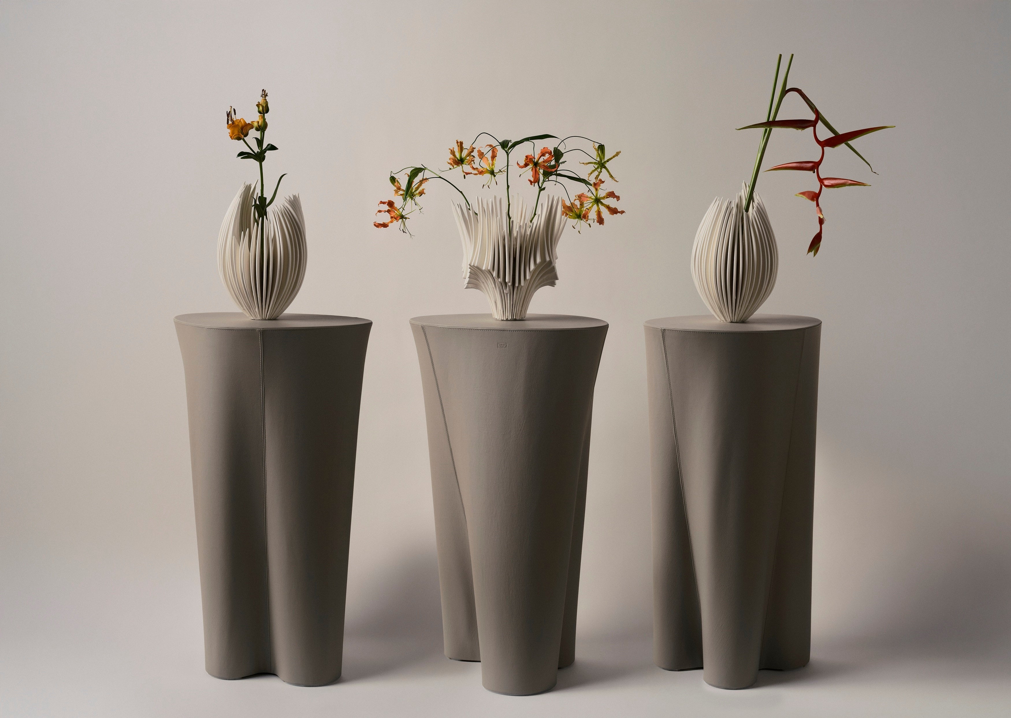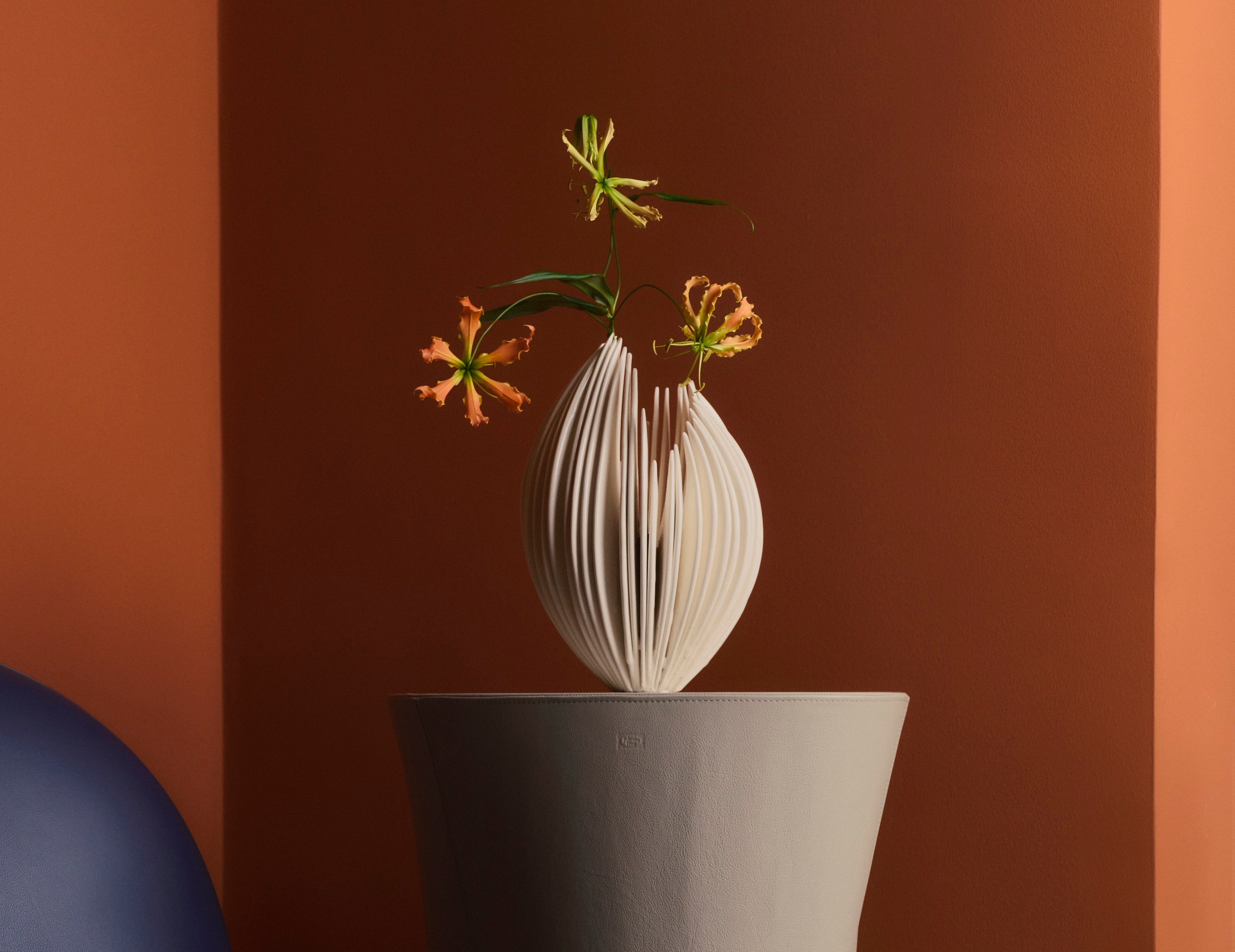 ポルトローナ・フラウが奈良祐希氏の代表作「Bone Flower」のために製作した特別モデルです。世界7カ国10都市の各店舗で数量限定販売されます。奈良氏がデザインを手掛けたこの展示台は、最高級レザー「Pelle Frau® (ペレ・フラウ)」で張り込まれ、奈良氏のセラミック作品と見事に調和しています。自然界の進化や樹木の構造からインスピレーションを得たデザインは、根、幹、枝、葉の成長を表現。レザーの折り目や影が生物の動きを彷彿とさせ、作品に生命感を宿します。また、側面の革がねじれることで生まれる模様は、多様な皺や影を生み出し、木の枝先に咲く蕾や花を思わせるとともに、命が芽吹く瞬間を想起させます。アート作品と展示台が一体化することで、時代を超えた美しさと空間に独自性を生み出し、見る人の記憶に深く刻まれる特別な存在感を放ちます。デザイン、アート、クラフトマンシップが密接に結びつき、日常に息づく美や豊かさへの探求が融合したコラボレーションです。