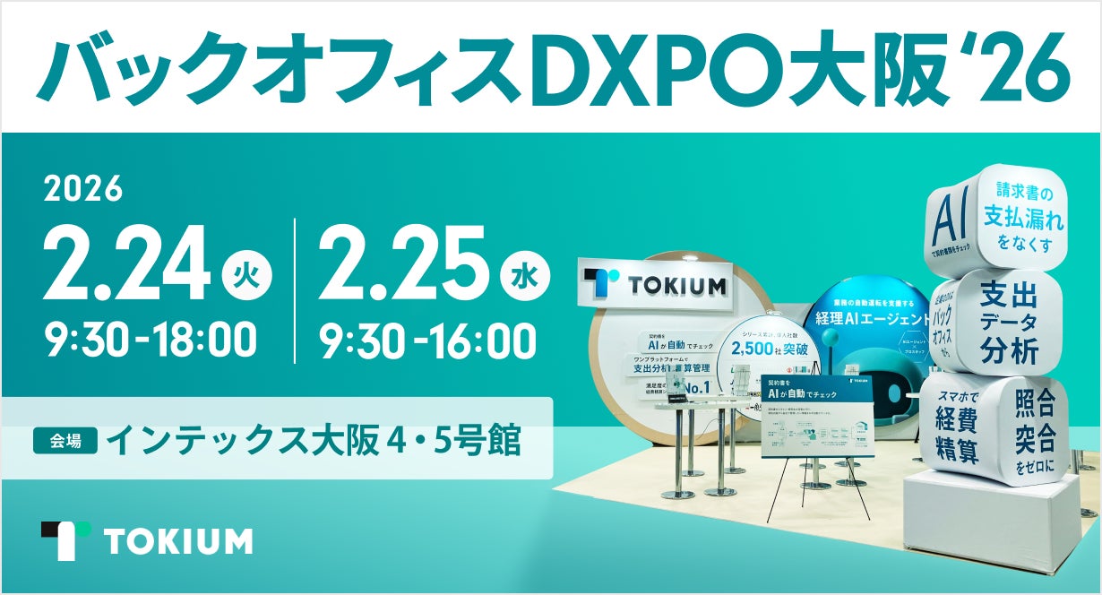経理AIエージェントを提供する株式会社TOKIUM(本社:東京都中央区、代表取締役:黒﨑 賢一、以下「TOKIUM」)は、2026年2月24日から2月25日までの2日間、インテックス大阪で開催される「バックオフィスDXPO大阪」に出展いたします。