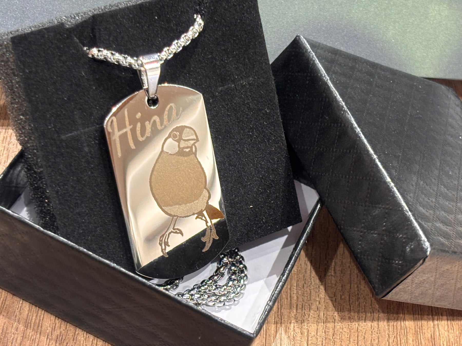 彫刻いたします。パスケースやステンレスネックレスが人気です。(予約不要)