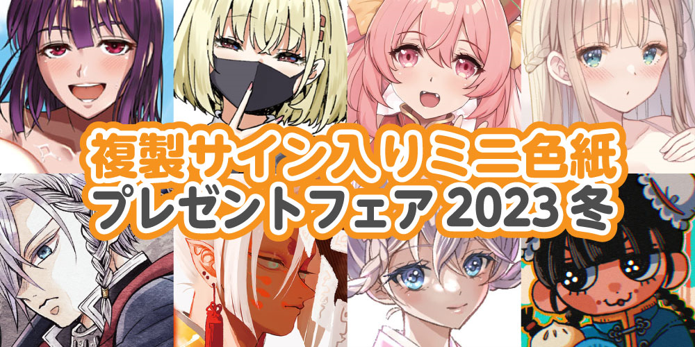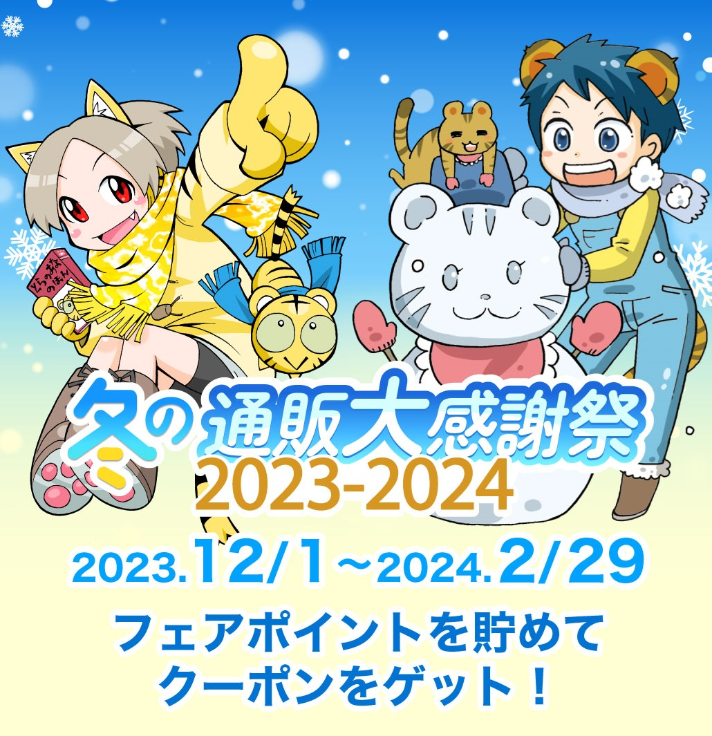 期間中は、フェアポイントを貯めてお得なクーポンがもらえる「冬の通販大感謝祭2023-2024」の他、対象サークル様の同人作品をご注文の方の中から先着で「複製サイン入りミニ色紙」をプレゼントする「複製サイン入りミニ色紙プレゼントフェア2023冬」や、同人誌・アニメ・CD・グッズが最大80%OFFとなる「とらのあな冬の還元祭2023-2024」に加え、新年1月1日より池袋店と出張所全店で開催の「冬の大感謝祭2024」など、キャンペーン企画が盛りだくさんです。