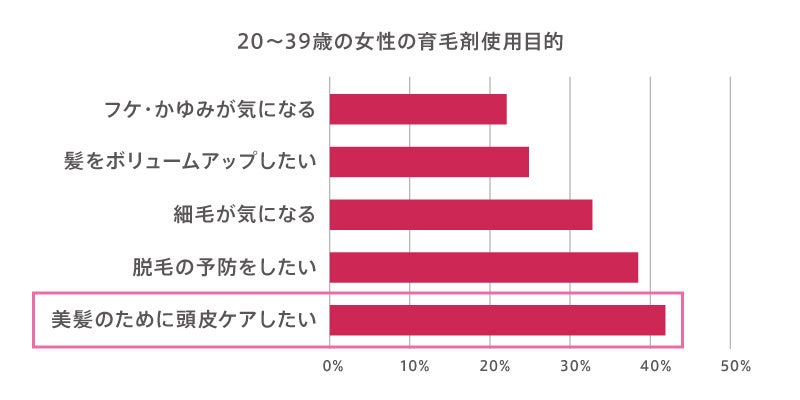 そこで、アンファーは20~59歳女性の育毛剤に対するアンケート調査を実施※3いたしました。その結果、20~39歳女性が育毛剤を使用する目的は「美髪のために頭皮ケアしたい」という回答が最も多く、42%を占めました。次点は「脱毛の予防をしたい」が39%を占め、「薄毛になってから育毛剤を使用する」という一般的なイメージとは異なり、若年層は「育毛剤で髪や頭皮をケアしたい」という予防ニーズがあることが推測できます。
