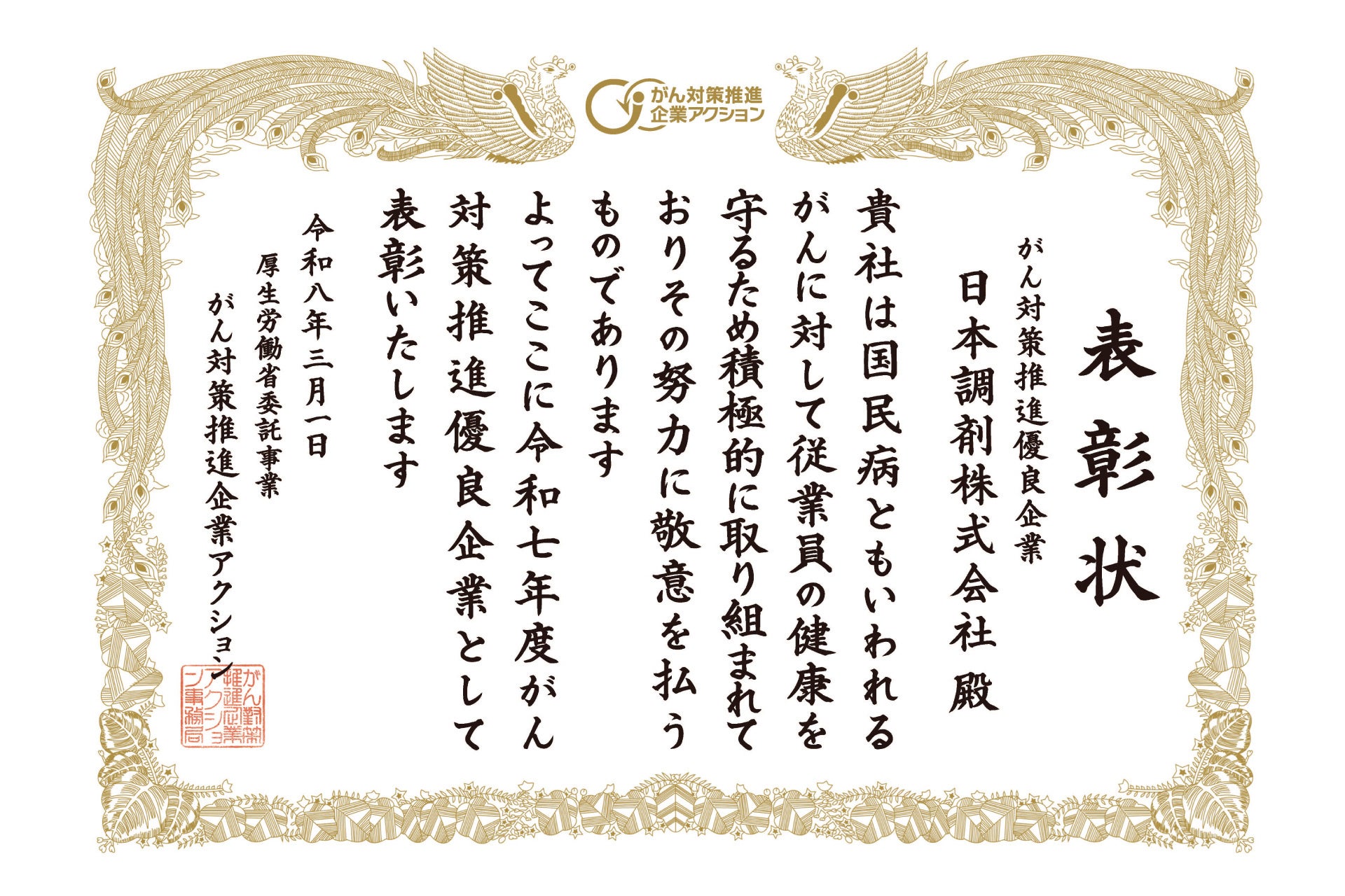 薬局の新たな価値を提供する日本調剤株式会社(本社:東京都港区、代表取締役社長:小城 和紀)は、2026年3月1日、厚生労働省が推進する「がん対策推進企業アクション」における「がん対策推進優良企業表彰制度」にて、「令和7年度 がん対策推進優良企業」として表彰されました。