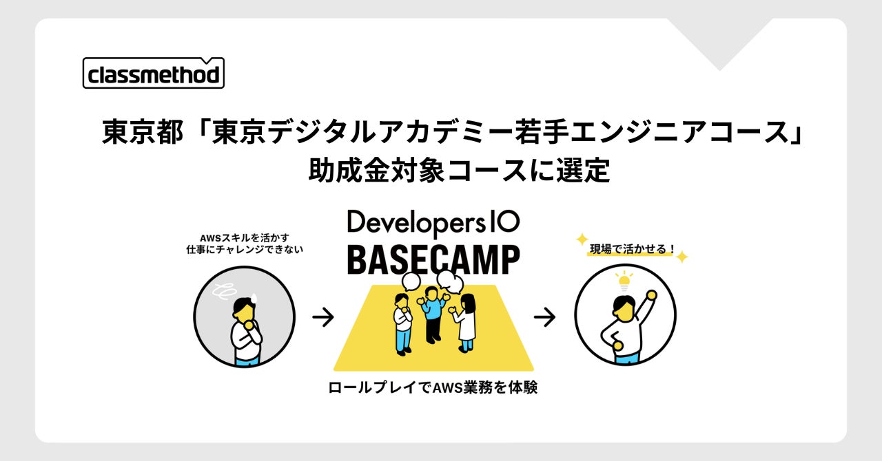 クラスメソッド株式会社(本社:東京都港区、代表取締役:横田聡、以下 クラスメソッド)は、実践型教育サービス「DevelopersIO BASECAMP(以下 デベキャン)」が東京都の「東京デジタルアカデミー若手エンジニアコース」において、助成金の対象プログラムとして選定されました。本プログラムは、都内在住または都内就業希望の35歳以下のITエンジニアを対象に、AWSクラウド技術などの実践的なリスキリングを提供し、キャリアアップを支援します。