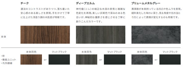 金属の無機質な風合いを再現した[METAL GRAIN(金属調)]、 天然木さながらの質感を表現した[WOOD GRAIN(木目調)]のデザインを含む3デザイン、3カラーのラインアップ