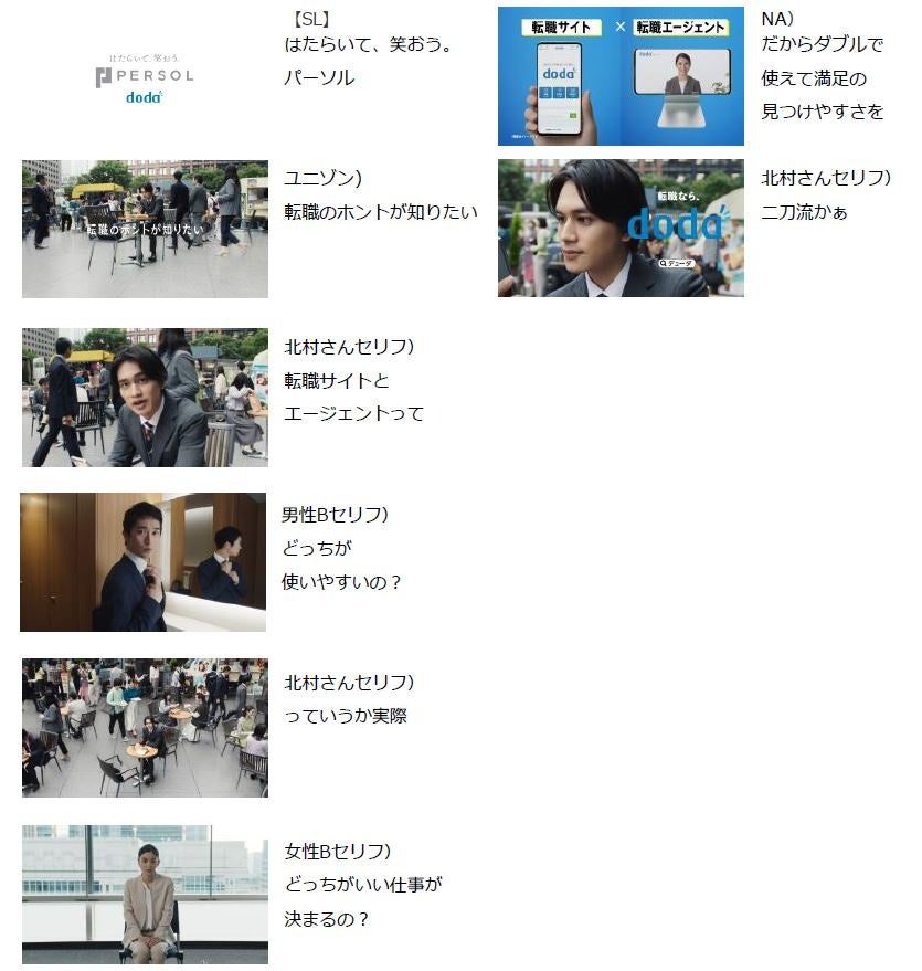 CMキャラクターには前回CMに引き続き北村 匠海さんを起用し、悩める転職希望者役を演じていただきました。dodaのサービス特徴を知った後の納得感のある「最大級かぁ」「二刀流かぁ」というセリフと、北村さんの爽やかな表情にご注目ください。