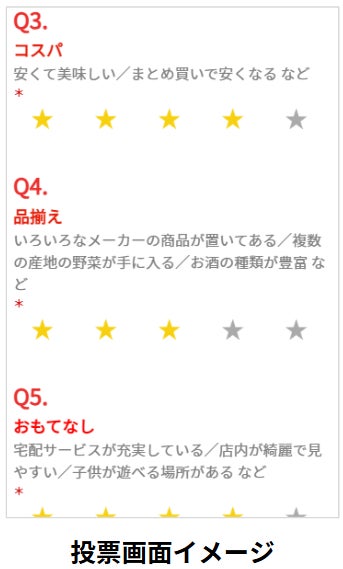【審査基準】コスパ・おもてなし・品揃え・チラシ・肉・魚・野菜・お惣菜の8項目を星5つで評価