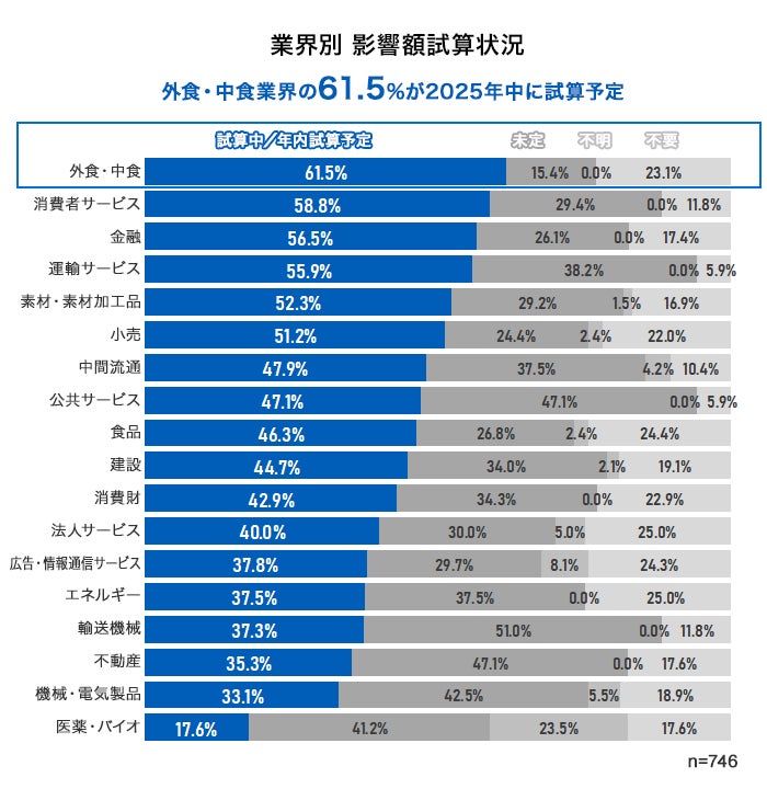 業界別では、外食・中食業界に勤める人の61.5%が、影響額を「試算中」または年内に開始予定と回答しました。