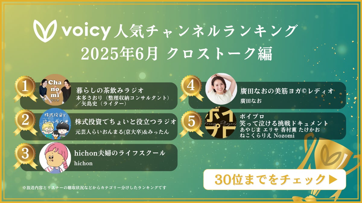 Voicyアプリの生放送機能で収録されたコラボ生放送と、同じくアプリのコラボ収録機能で収録された放送のうち、最も聞かれた放送のTOP30を毎月発表していきます。