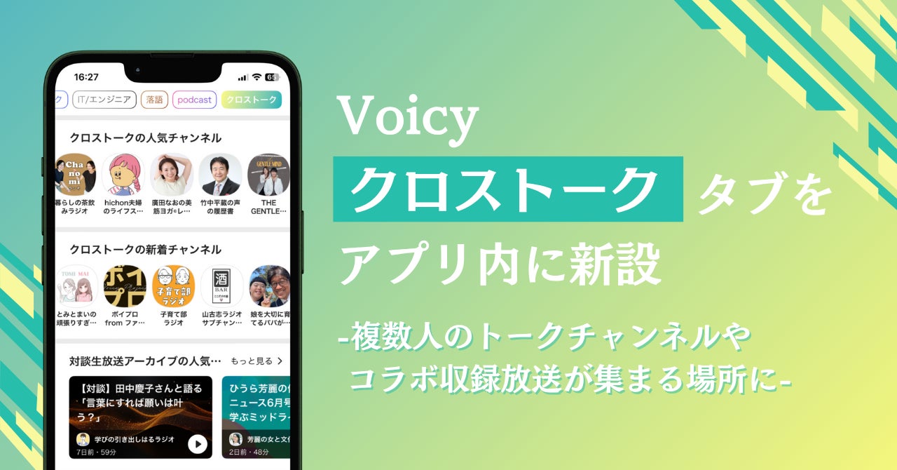 音声プラットフォーム Voicyは、リスナーとパーソナリティ双方のニーズに応え、7月9日(水)より「クロストーク」タブをアプリ内に新設いたしました。このタブでは、様々なジャンルのパーソナリティ同士の対談やコラボレーション放送が集まり、多様な視点や専門的な知見が交差するコンテンツをお楽しみいただけます。