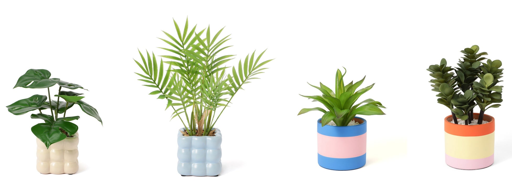 ポット付きのアートグリーンです。もこもことした形状や、カラフルなペイントを施したポップなデザインのポットは、置くだけでインテリアのアクセントに。デスクやサイドテーブルに飾りやすい小さめサイズです。