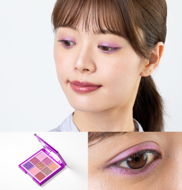 アイシャドウベースを塗布後、パレットのPurple Lilac(上段左)を目幅に合わせてアイホール全体に塗ります。更に紫を可愛く見せる為に、周辺の縁取りにパレットのGalaxy(上段中央)を色味を囲むように細筆で入れる事でより華やかさをアップ!ピンクなどと混ぜたり、お持ちのラメをベースに重ねたりすると、より可愛らしい印象になります。