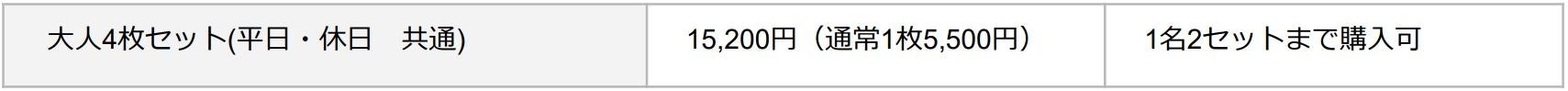大人4枚セット(平日・休日 共通) | 15,200円(通常1枚5,500円) | 1名2セットまで購入可 |