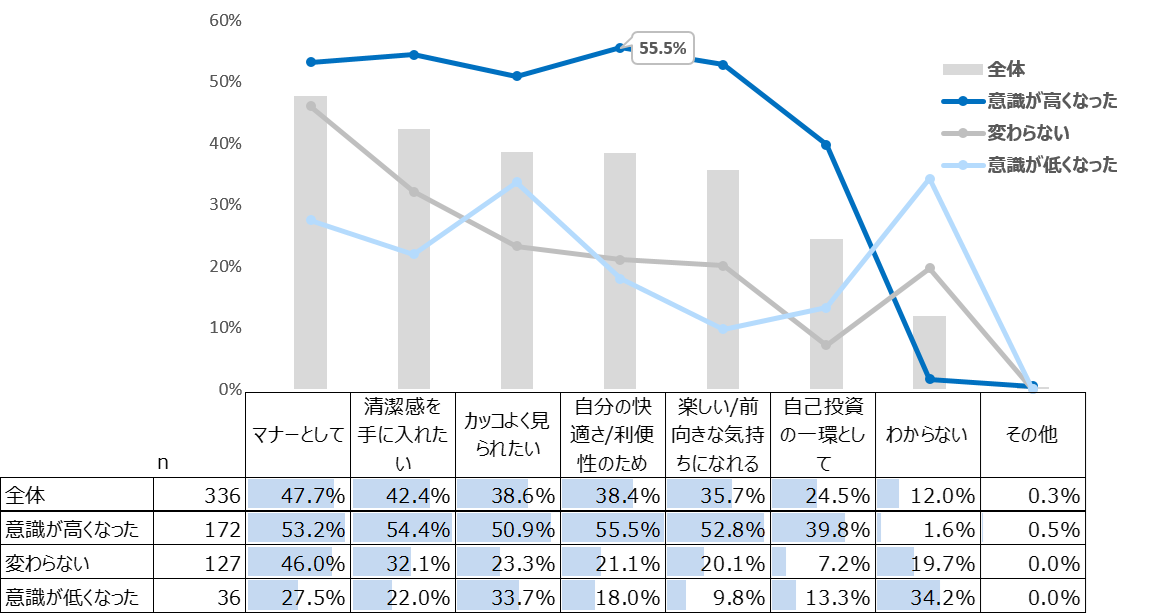 「身だしなみへの意識が高くなった人」は身だしなみを整えている理由として「自分の快適さ/利便性のため」が最も多いのに対し、従来「変わらない人」は「マナーとして」が最も多くなっています。マナーとして、身だしなみを整えるよう推奨されることもありましたが、ここ数年で身だしなみへの意欲が向上した人は「自分のため」と捉える傾向があることが分かりました。