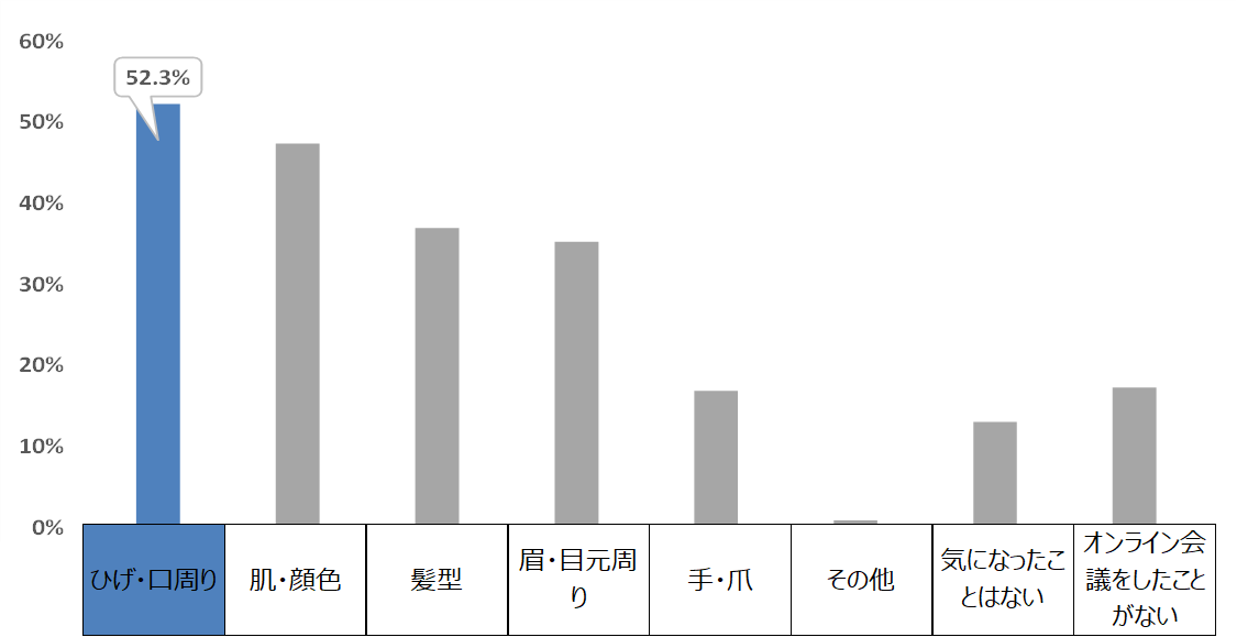 気になったことがある人に「どこが気になったか?」を聞いたところ、最も多かったのは「ひげ・口周り」で気になったことがある人のうち52.3%にのぼりました。外出が減り、マスク生活が定着した影響が伺える結果となりました。