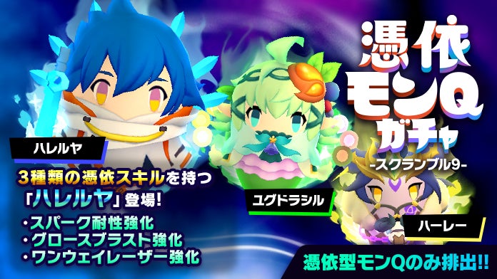 憑依型のモンQのみが排出される「憑依モンQガチャ」に、モンストでおなじみの「ハレルヤ」「ユグドラシル」「ハーレー」が味方のオバケ「モンQ」としてガチャに登場します。