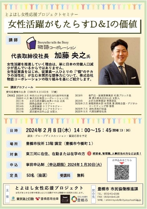 「焼肉きんぐ」や「丸源ラーメン」などで知られる「(株)物語コーポレーション」(本社・愛知県豊橋市)の代表取締役社長、加藤央之さんを講師に招いた「とよはし女性応援プロジェクトセミナー」が2024年2月8日(木)、愛知県にある豊橋市役所講堂で開催されます。2020年に34歳の若さで社長に就任した加藤さんから、女性従業員をはじめ、従業員一人ひとりの「“個“のチカラの活性化」が生む本質的な競争力について学べるチャンスです。特に経営者や管理職、人事担当者の方などにオススメです!