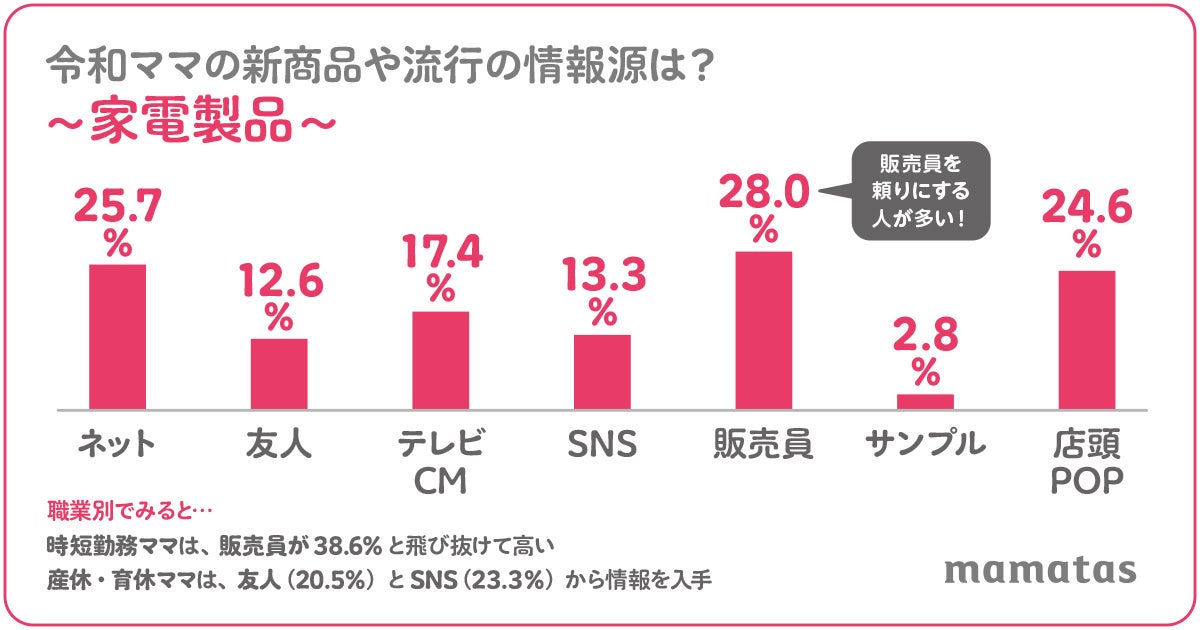 - 「家電製品」は28.0%の令和ママが、『店頭の販売員』を頼りにしている