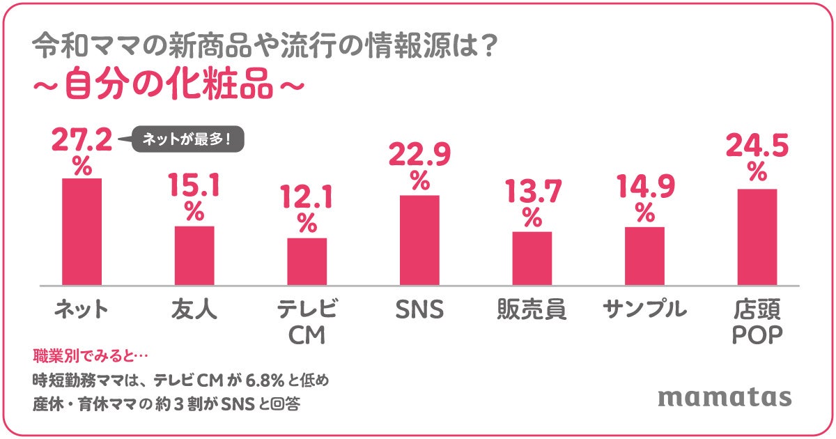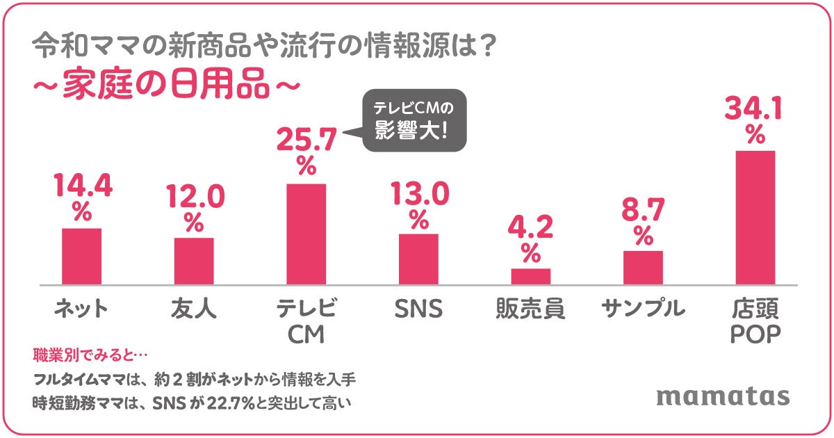 ただし時短勤務ママは『テレビCM』が20.5%と低め、逆に『SNS』から情報を得ている人が22.7%と、平均よりも約10%高い結果に。