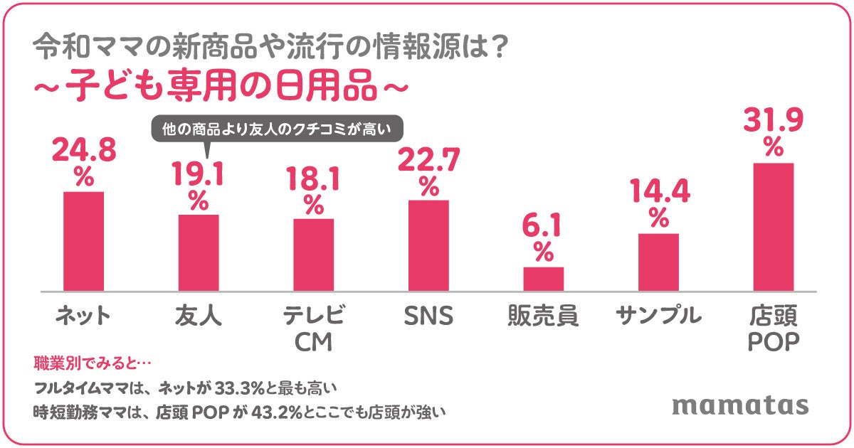 【商材別】令和ママにアプローチするならどのチャネル?新商品情報は『店頭POP』、自分の化粧品や子ども日用品は『SNSを活用』などママの情報源が明らかに