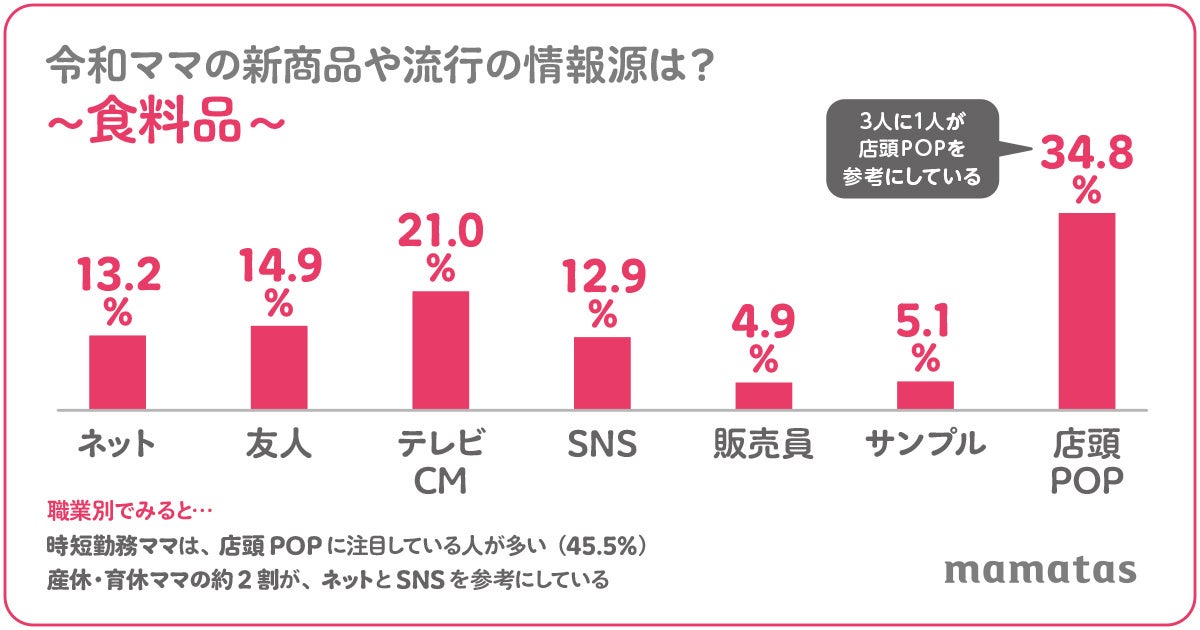 令和ママがテレビCMよりも、SNSや友人のクチコミで情報を得ていることは想定内でしたが、店頭のPOPや店舗の販売員などを情報源としておおいに活用しているという一面も明らかに。特に店頭のPOPは、食料品や日用品で3人に1人、化粧品や家電では4人に1人が活用。忙しい令和ママたちの情報源として欠かせない存在と言えそうです。
