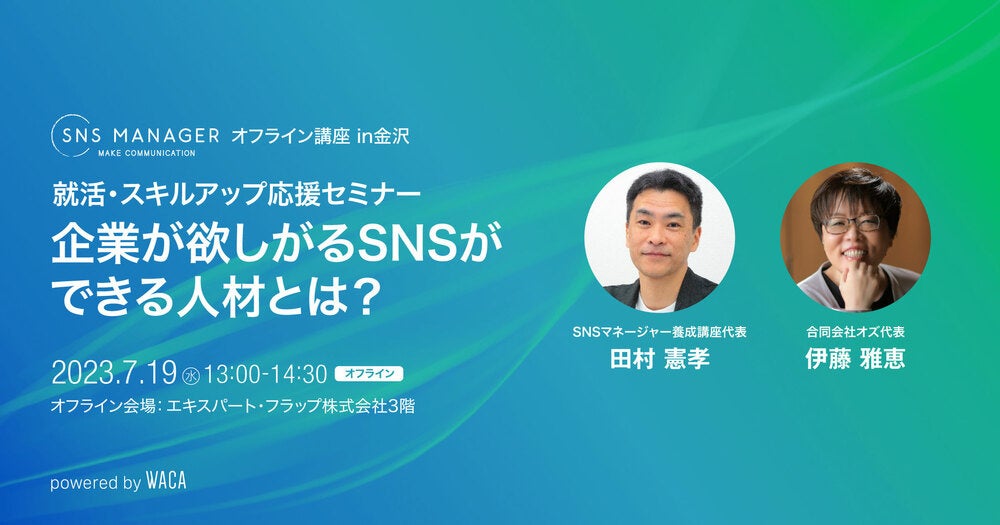2023/7/19(水)13:00-14:30【SNSマネージャーオフライン講座】in金沢 就活・スキルアップ応援セミナー「企業が欲しがる、SNSができる人材とは?」