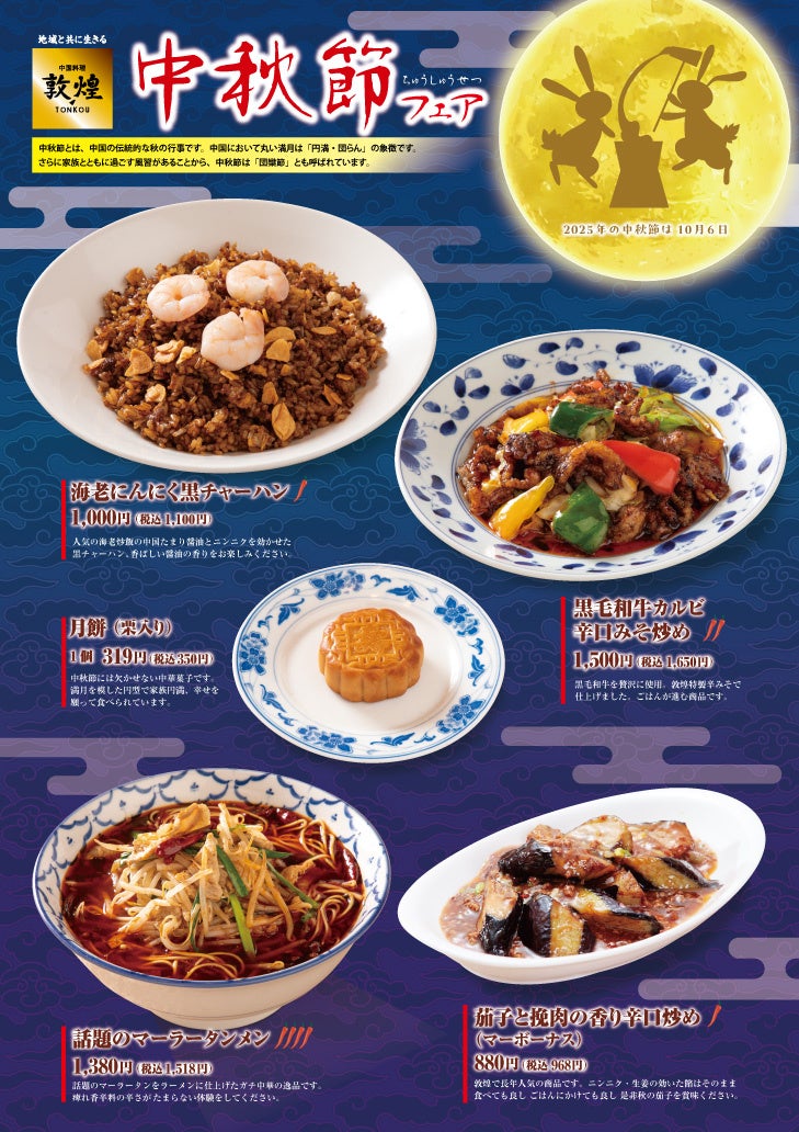 四川料理をベースに、中国料理店として伝統と現代のトレンドが調和する料理を提供してきました「敦煌」では11月下旬まで「中秋節フェア」を開催いたします。中国では“ 家族団らん ” を意味する行事で、この機会に「食の原点」、みんなで笑顔で楽しんでいただければと思います。巷で人気沸騰中の「マーラータン」を敦煌風にアレンジした「マーラータンメン」ではクセになる痺れる辛さをご堪能いただければと思います。また、敦煌の食べやすい「辛さ」を交えた「黒毛和牛カルビ 辛口みそ炒め」などのメニューもお楽しみください。甘味に中秋節の代名詞・月餅もございます。この機会に是非、ご利用ください。皆さまのご来店をスタッフ一同お待ちしております。