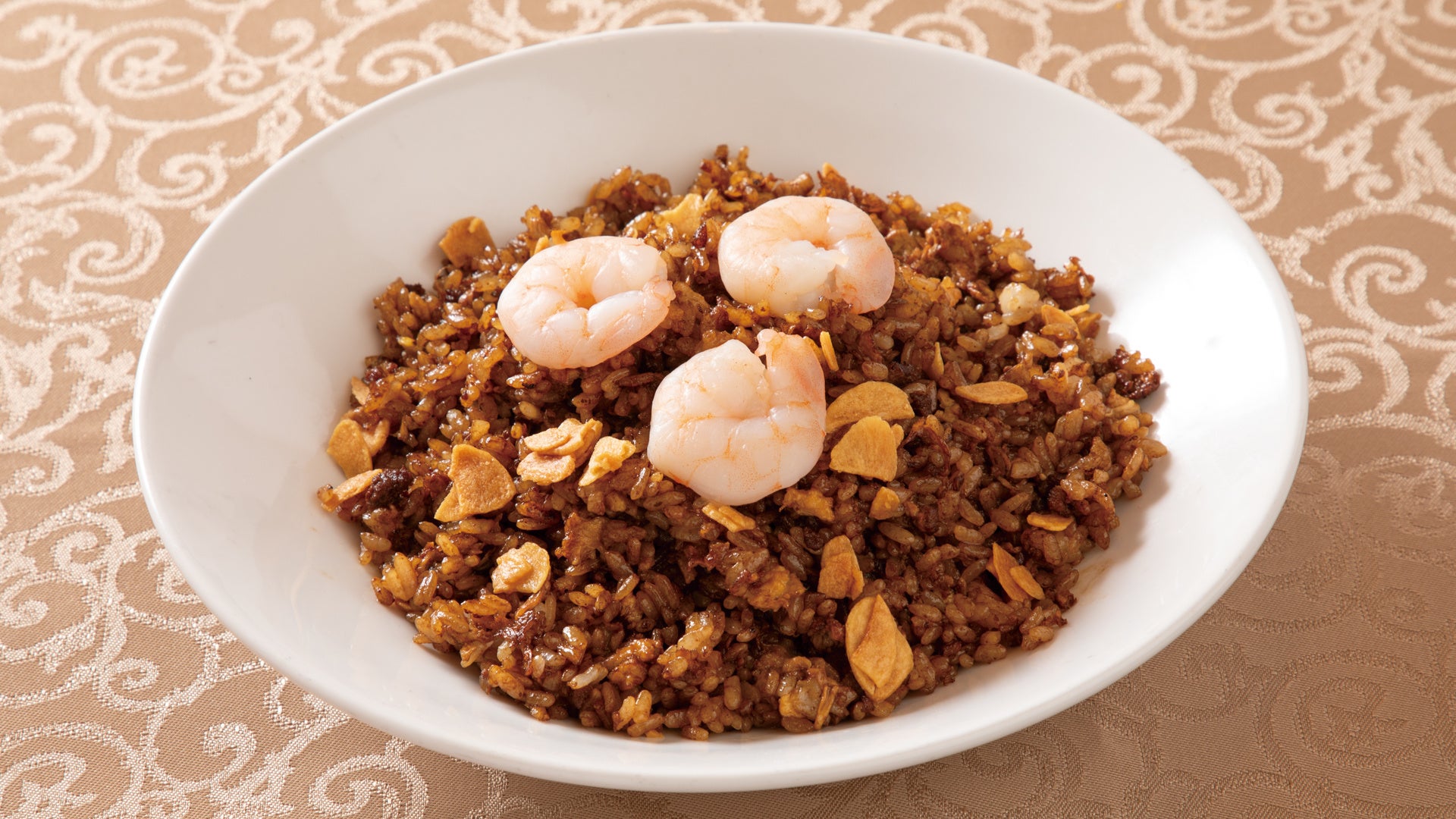 人気の海老炒飯の中国たまり醤油とニンニクを効かせた黒チャー