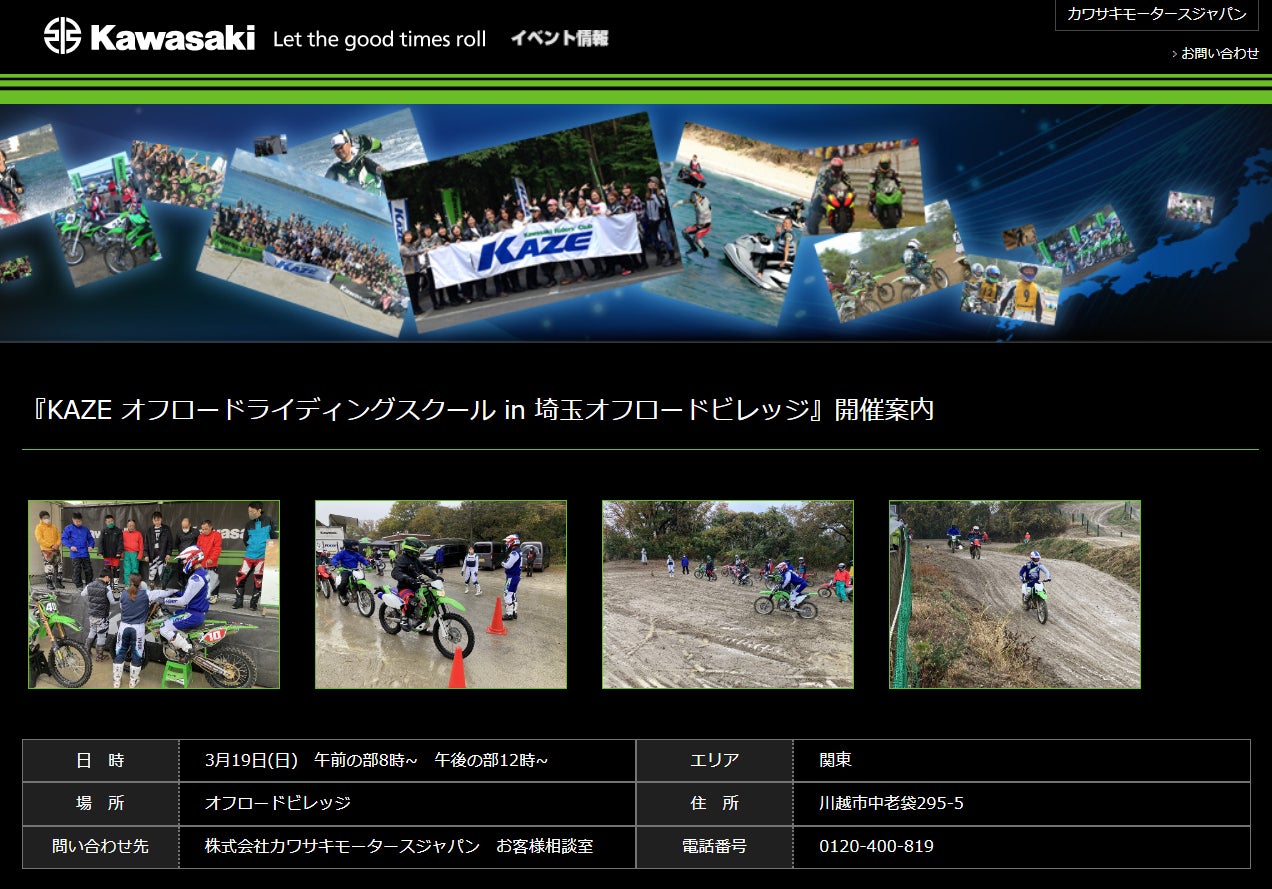 株式会社カワサキモータースジャパン(本社:兵庫県明石市、代表取締役社長:桐野 英子)は、3月19日(日)に埼玉オフロードヴィレッジ(埼玉県川越市)にて、「KAZE オフロードライディングスクール in 埼玉オフロードヴィレッジ」を開催いたします。https://www.kawasaki-motors.com/event/EventInfo?seq=4217&contents=1&year_select=2023&month_select=03