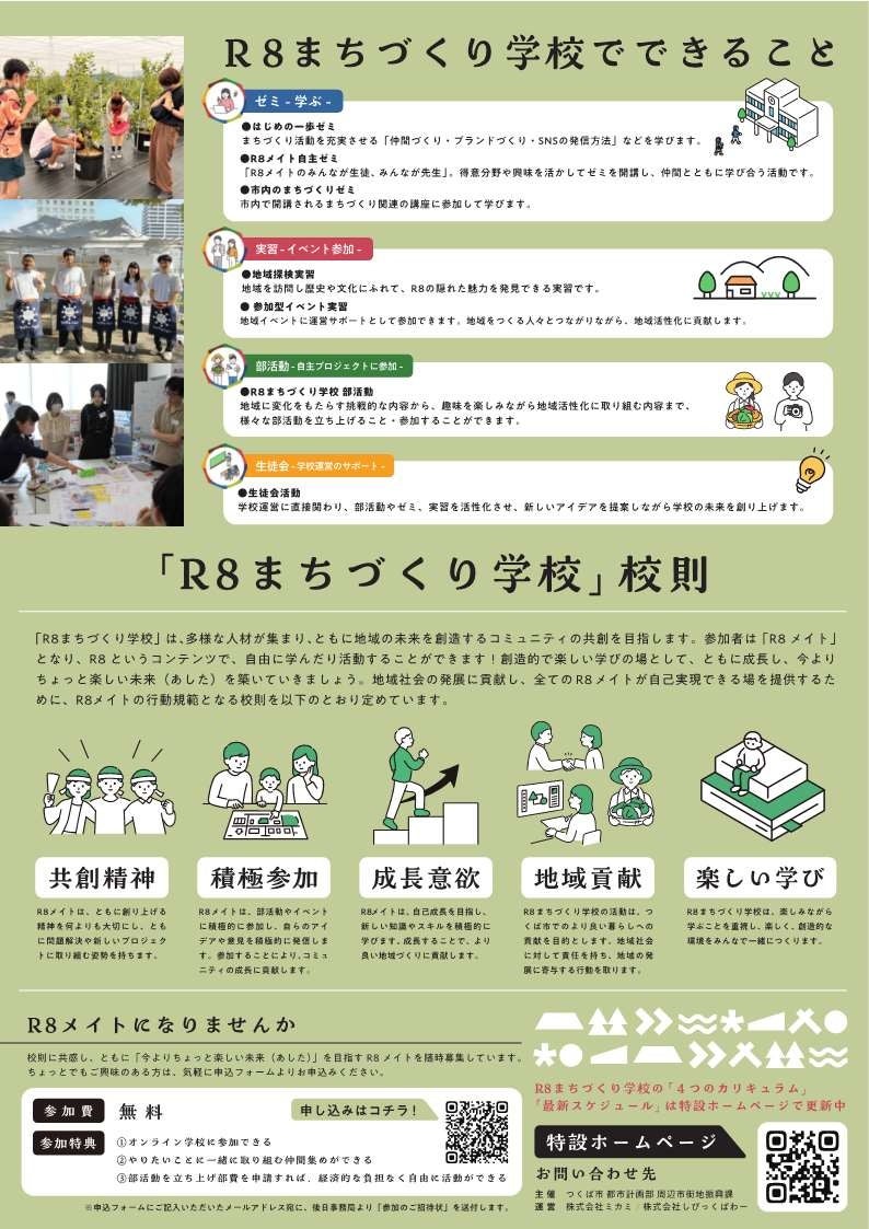 つくば市の周辺市街地(愛称:R8)の地域づくりをテーマに、みんなで学び、実践するプロジェクト「R8まちづくり学校」への参加者を募集します。