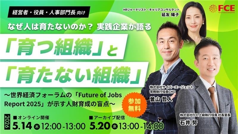 株式会社FCE(東京都新宿区、代表取締役社長:石川淳悦、証券コード:9564)は、2026年5月14日(木)に、株式会社サイバーエージェントの常務執行役員CHOである曽山哲人氏をお招きし、さらにファシリテーターとして HRジャーナリスト・キャリアコンサルタントの延友陽子氏を迎え、オンライン無料イベント「なぜ人は育たないのか? 実践企業が語る「育つ組織」と「育たない組織」〜世界経済フォーラムの「Future of Jobs Report 2025」が示す人財育成の盲点〜」を開催いたします。
