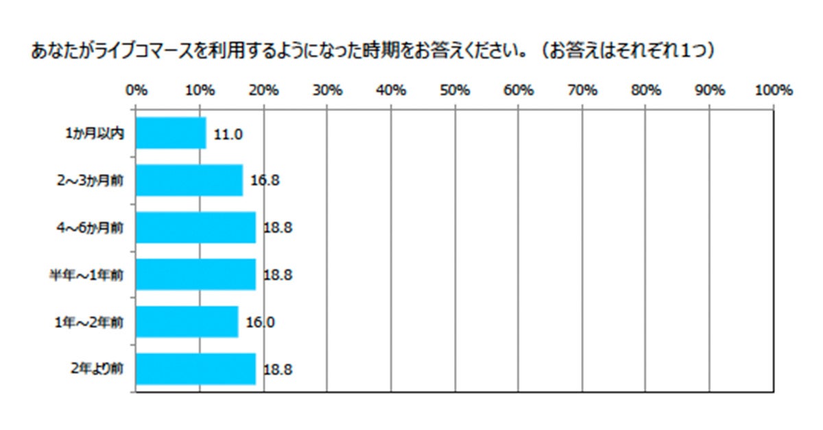 ライブコマースの利用開始時期を尋ねたところ、特出した傾向はないものの、全体の65.4%が「直近1年以内に視聴し始めた」と回答。コロナ禍で日本市場においてライブコマースの認知が広がる中、ライブコマースの利用ユーザーは着実に増加しつつあることが浮き彫りとなりました。