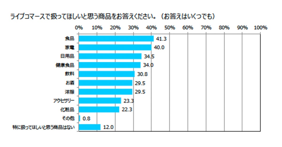 「ライブコマースで扱ってほしいと思う商品をお答えください」という質問では、食品(41.3%)や家電(40%)、日用品(34.5%)、健康食品(34%)が上位にランクイン。また、前述の質問で27%の人が「ライブコマースで家電製品を購入したことがある」と回答した一方、今回の質問では40%の人が「ライブコマースで家電製品を扱ってほしい」と回答していることから、前述の質問で明らかになった「ライブコマースにおける家電製品の購入経験者」の割合より上回っていることが分かりました。この結果から、ライブコマースにおける家電製品の販売需要は高い一方で、実際はライブコマースで家電製品を取り扱っている配信が少ないことが考えられます。