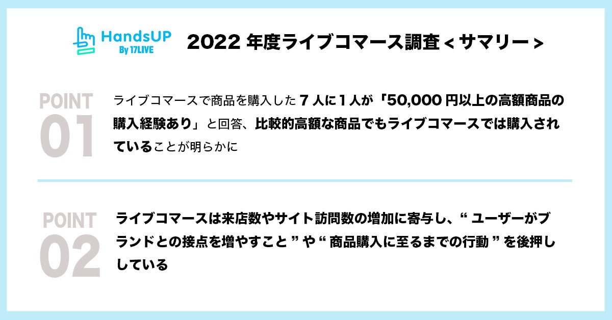 URL:https://handsup.17.live/whitepaper/usage_survey_2022/【「2022年度 ライブコマースにおける利用実態調査」に関するユーザーアンケート調査概要】