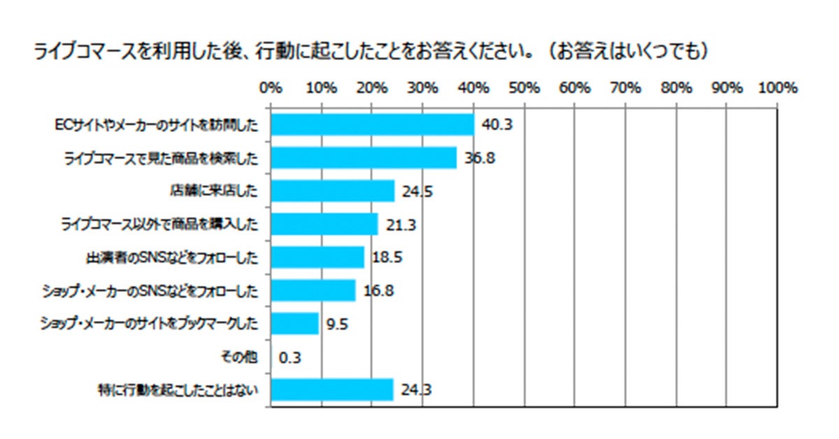 24.3%のユーザーが「特に行動を起こしていない」と回答しているものの、そのほかの人は「SNSをフォロー」「ライブコマース以外で商品を購入した」といった回答を多数寄せられていることから、ライブコマースがユーザーに対して“商品購入に至るまでの行動”を後押ししていることが考えられます。同時のこれらの回答結果からは、ライブコマースは来店数やサイト訪問数の増加に寄与し、“ユーザーがブランドとの接点を増やすこと”も後押ししていることが分かりました。