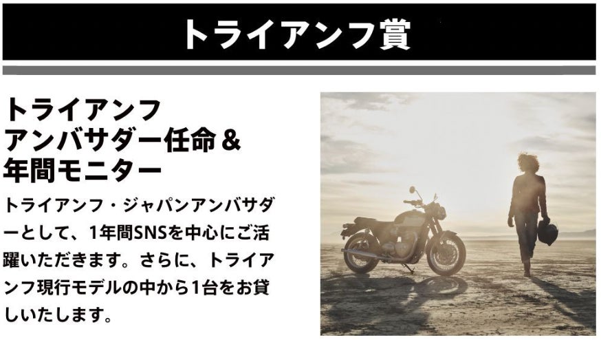 最優秀賞の「トライアンフ賞」に選ばれた方は、「トライアンフ アンバサダー任命 & 年間モニター」を賞品としてご用意しています。