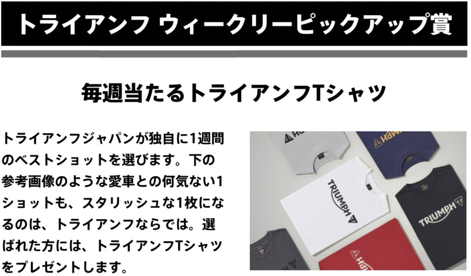 さらに、毎週トライアンフがベストショットを選ぶ、ウィークリーピックアップ賞も実施。