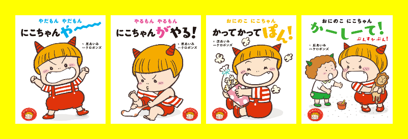 おにのこにこちゃんは、ポプラ社の子育て中の社員の声から生まれた、親子を笑顔にする「のびのび読み」活動からの派生プロジェクトより誕生したキャラクター。イヤイヤ期真っ最中のおにの子で、とにかく元気であばれんぼうだけど、ママとパパが大好き。いやなことやできないことに立ち向かいながら、すくすく成長中!
