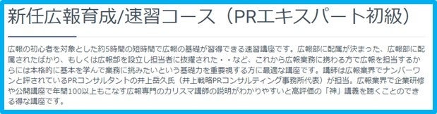 この「日本広報教育センター」は広報部に配属された広報初心者の方を対象に新任向けeラーニング講座「新任広報育成講座 速習コース」提供しております。開講から約2年で1000人以上が受講し、新任広報パーソンの定番講座として定着しております。