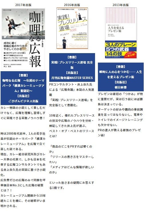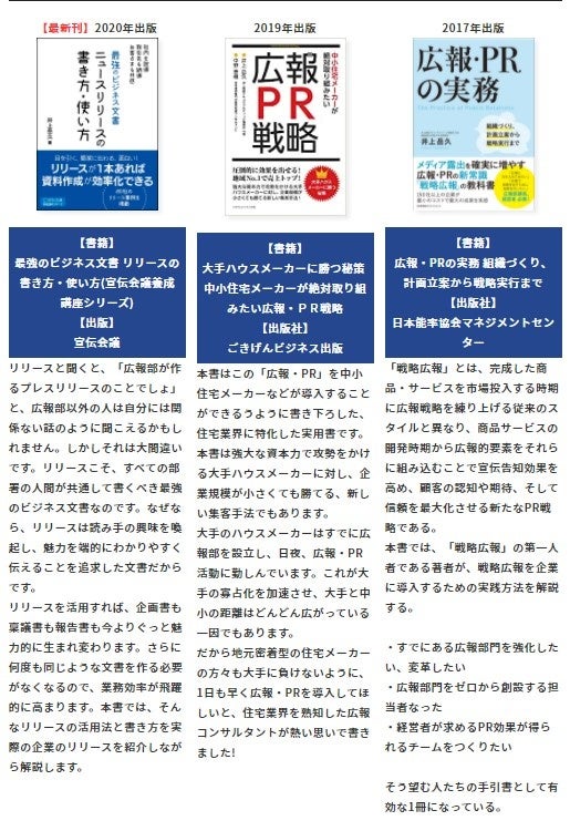 著作/『新プレスリリース完全版』『最強のビジネス文書 ニュースリリースの書き方・使い方』『広報入門』(宣伝会議)、『広報・PRの実務 組織づくり、計画立案から戦略実行まで』(日本能率協会マネジメントセンター)、『一億人の大好物 カレーの作り方』、『国民食カレーで学ぶもっともわかりやすいマーケティング入門』(日東書院本社)など多数